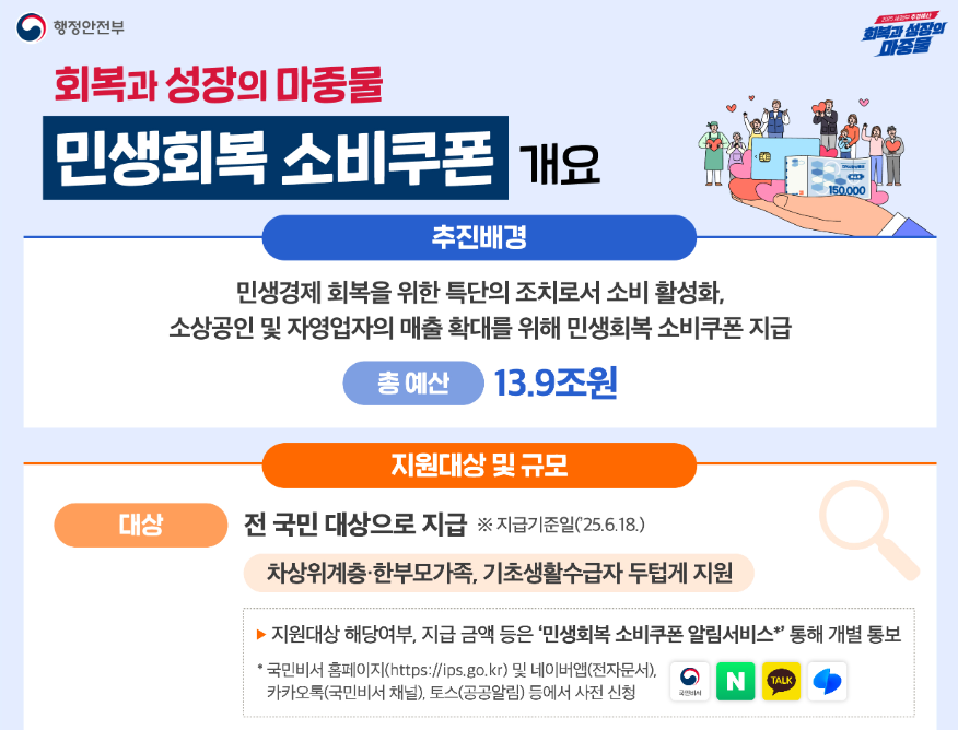 정부가 경기 활성화와 서민 지원을 위해 전 국민에게 지급하는 소비 쿠폰입니다.